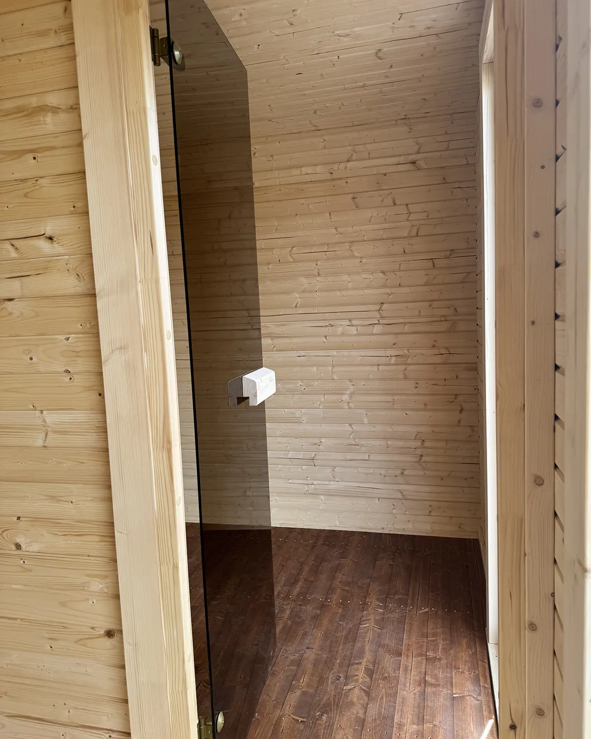 Į pirtį veda stiklinės durys, kurios praleidžia šviesą ir išlaiko erdvės pojūtį, yra specialiai suprojektuotos saugumui. Jos neužsitrenkia, todėl prireikus lengvai pasistumia ir atsidaro į priepirčio zoną – tai ypač svarbu, jei pirtyje pasidaro per karšta ar prireikia greitai išeiti. Išorėje į priepirčio zoną montuojamos medinės rakinamos durys su pilno stiklo intarpu, kurios užtikrina patvarumą, privatumą ir patikimą naudojimą kasdien. Siekiant užtikrinti patogiausią pirties patirtį, grindims pritaikyti skirtingi sprendimai. Pirties patalpoje naudojamos neapdorotos terasinės lentos, kurios leidžia orui cirkuliuoti ir nesikaupti drėgmei, todėl grindys greitai išdžiūsta. Tuo tarpu priepirčio erdvėje įrengtos grindinės lentos, dažytos skaidria teak spalva – jos lengvai prižiūrimos ir kartu išlaiko estetišką, šiltą vaizdą.